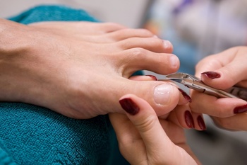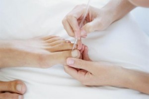 Следующий этап педикюра- обработка ногтей. Очищенный от лака ноготь большого пальца следует срезать в три-четыре приема, для того чтобы ногтевая пластинка не расщеплялась. Ее нельзя обрезать под углом - иначе может начаться онихокриптоз. Подрезанные ногти обрабатываются пилочкой.